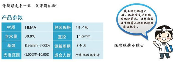 产品说明: ★成熟而稳定的离心浇铸工艺 ★添加保湿因子,有效锁住水份,配戴清润、舒适,保湿一整天 ★镜片成形性良好,配合优越光学性能,能矫正低度散光,提供卓越视觉质量